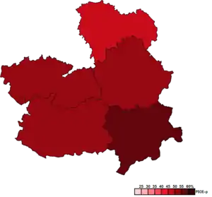 The 47 members of the Cortes of Castilla–La Mancha were elected using the D'Hondt method and a closed list proportional representation, with an electoral threshold of three percent of valid votes—which included blank ballots—being applied in each constituency. Additionally, the use of the D'Hondt method might result in an effective threshold over three percent, depending on the district magnitude.[2] Seats were allocated to constituencies, corresponding to the provinces of Albacete, Ciudad Real, Cuenca, Guadalajara and Toledo. Each constituency was allocated a fixed number of seats: 10 for Albacete, 11 for Ciudad Real, 8 for Cuenca, 7 for Guadalajara and 11 for Toledo.[1][3]