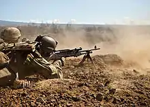 On 25 October 2000 a battlegroup based upon 1 RAR took over the role of the Australian Battalion of UNTAET from 6 RAR.[20] 1 RAR assumed control over 1500 km2 of East Timor. The battalion's mission was to provide security to the people of East Timor so that civil infrastructure and government systems could be re-established under the guidance of the UN in order to help the East Timorese transition to an independent nation. Actions taken by the battalion resulted in one militia killed and one friendly wounded.[3] In April 2001, 1 RAR was relieved by 4 RAR.[21] The battalion deployed on its second tour of East Timor with UNMISET in May 2003, taking over from 5/7 RAR.[22]