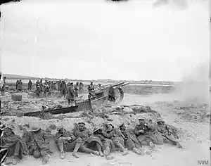 A 60-pounder battery firing in the open during the German Spring Offensive, 1918.