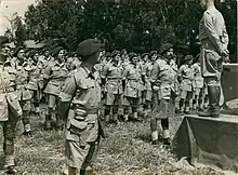 - ↑ Lieutenant-General Frederick Browning pointed out to the brigade that this was an honour, as "distinctions given by the enemy are seldom won in battle except by the finest fighting troops."[32] Following official confirmation by General Sir Harold Alexander, the title was thereafter applied to all British airborne troops.[33] A demonstration of the respect in which the Germans held the Red Devils occurred when a train carrying the 1st and 2nd Battalions to Algiers passed a large prisoner of war camp. The Germans spotting their red berets, started cheering, and over a thousand prisoners ran towards the train throwing their own hats in the air.[31]