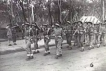 Following the end of hostilities in the Pacific, the size of the squadron was slowly reduced as men who had enough points to do so were returned to Australia for demobilisation, while others were transferred to other units of occupation duties. As they waited for transportation back to Australia, the squadron undertook further reconnaissance of the area around Kuala Penyu, improving the accuracy of maps of the Klias Peninsula. In September they were moved to Mepakula and then to Beaufort, before returning to Labuan in December 1945.[6] Finally, however, the men that remained in the squadron were returned to Australia and in January 1946, at Chermside camp in Brisbane, the 2/11th Commando Squadron was officially removed from the Australian Army's order of battle.[6]