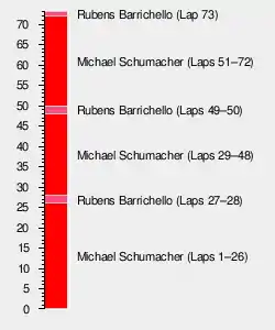 Barrichello did not realise he had won the race until his crew told him over the radio late on the cool-down lap.[72] The top three drivers appeared on the podium to collect their trophies and spoke to the media in the subsequent press conference.[75] Barrichello called the win "very special" and said, "To win, it was very, very, very good... I got to the last corner, I didn't know what to do and nothing has been said. Michael was just very kind to, you know, let us finish equally. I guess I pointed a little bit in front, but, you know, what can we say?"[76] Michael Schumacher, who was reportedly angry over finishing second,[77] praised his team's strategy and his car, "I think the strategy we used, two stops in the end was supposed to be by about ten seconds faster. But would we have been stuck behind, then our strategy could have been a problem. So, all in all, we did the right thing at the right time."[76] Coulthard explained that being stuck behind slower cars was his attempt to not lose too much time and stay in third place, and he expressed astonishment at his quick start despite the heavy fuel load.[76]