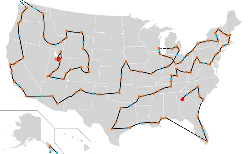 Union Pacific, another of the relay providers, used a specially designed railroad car to carry the flame across various areas of the United States (mainly rural and desert areas). Coined the "Cauldron Car", it was part of Union Pacific's "Olympic Train", which included two diesel locomotives (UP Numbers: 2001 & 2002), 13 passenger cars, and 3 service cars with the cauldron car serving as the caboose.[14] The entire train was painted in Olympic livery, using Salt Lake's "Look of the Games" style, known as "Land of Contrast - Fire and Ice". The cauldron car contained a 2 million-BTU burner, to keep the flame burning, was originally used during the torch relay for the 1996 Summer Olympics, and was simply redesigned and repainted for the 2002 games.[15] The Olympic train carried the flame on four separate occasions during the 2002 torch relay, for a total of more than 3,200 miles (5,100 km) through 11 states.[16] Following the games the cauldron car was donated to the Utah State Railroad Museum at Union Station, where it is currently on display. In anticipation of the torch relay Overland Models (model railroading) created an H0 scale model of the Olympic Train, which included the two locomotives and several of the passenger cars.