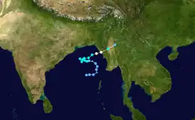 The second storm of the season formed as a depression on May 16 in the central Bay of Bengal. With low wind shear and a surge in the monsoon trough, the storm intensified while meandering over open waters. The storm eventually began a steady northeastward motion due to a ridge to the north over India. While approaching land, an eye developed in the center of the storm, indicative of a strong cyclone. On May 19, the cyclone made landfall along northwestern Myanmar near Sittwe, with maximum sustained winds estimated at 165 km/h (105 mph) by the IMD.[1][2][4] The storm rapidly weakened over land, although its remnants spread rainfall into northern Thailand and Yunnan province in China.[4]