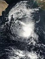 A tropical disturbance was observed on November 19 about 800 km (500 mi) southeast of Colombo, Sri Lanka in the Bay of Bengal.[26] The disturbance tracked westward, weakening after passing south of Sri Lanka.[25] It entered the Arabian Sea on November 26, and despite being located unusually close to the equator, the system maintained convection about its circulation, aided by low wind shear.[25] While the system was organizing, the center crossed the equator to reach about 0.5° S, thus becoming an anticyclonic circulation in the southern hemisphere. This was unusual, as the Coriolis effect is nonexistent along the equator—the Coriolis effect refers to planetary vorticity, which provides the spin in a cyclone.[26][27] On November 28, the JTWC classified it as Tropical Cyclone 05A just 78 km (48 mi) from the equator.[25] The IMD classified it as a depression the next day at 1.5° N, noting that "cyclogenesis ... at such low latitudes has not occurred in the past."[1] It rivaled Tropical Storm Vamei as one of the closest storms to the equator.[25]