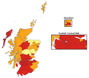 Labour won 41 seats, the Liberal Democrats 11, the Scottish National Party six, and in Dumfriesshire, Clydesdale and Tweeddale the Conservatives won their only Scottish seat.[2] Compared to the actual general election results of 2001, this meant a loss of fourteen seats for Labour, a gain of one seat for the Scottish National Party and the Liberal Democrats, and no change for the Conservatives.[3]