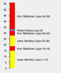 As the track dried Hamilton began to suffer from tyre wear. With his pit stop imminent, McLaren elected to keep Hamilton out and stick to the original strategy. This turned out to be a detrimental choice, because by lap 31, Räikkönen had passed Hamilton when the latter ran wide, allowing Räikkönen to take the lead. Hamilton had to come into the pits. This should not have been a problem, however, as he would still have had enough points to secure the World Championship, had he remained in that position. However, as he entered the pit lane with his tyres worn down to the canvas, he failed to negotiate the sharp left-hander into the pits, beaching his car in the gravel. Despite marshal's efforts to get him back into the race, he suffered the first retirement of his career.