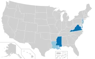 Democrats held control of both chambers of the New Jersey and Louisiana legislatures, and held control of the Mississippi House of Representatives. Meanwhile, Republicans held control of the Virginia House of Delegates. Meanwhile, Democrats gained control of the Virginia and Mississippi Senates, however, Democrats had only lost control of the latter chamber at the beginning of the year when Senators James Walley and Tommy Gollott switched parties from Democratic to Republican.[2]