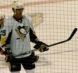 The Penguins won their first six games in November before losing in a shootout on November 18.[26] Rob Scuderi and Hal Gill were selected by Therrien to be November's alternate captains, taking over for Brooks Orpik and Malkin who served in October.[27] On November 11, the Penguins returned to Detroit for the first time since the 2008 Stanley Cup Finals.[28] The third goal of Jordan Staal's second career hat-trick came with 22.8 seconds remaining in regulation, sending the game into overtime where the Penguins achieved a 7–6 victory.[29] Malkin's 13-game point streak ended on November 18, during the streak he scored 27 points.[30] Through November 19, the Penguins led the league in overtime games with nine of 18 games taking extra time to decide.[31] Through the first 20 games of the season, Mike Zigomanis led the league in faceoff percentage and Alex Goligoski led rookie defensemen in points.[32] After an injury to Marc-Andre Fleury, Dany Sabourin and rookie John Curry split goaltending duties in his multi-game absence in which the team was 5–6–2.[33][34] On November 26, Malkin scored three goals for his third career hat-trick,[35] three days later Sidney Crosby also achieved a hat trick—the second of his career.[36] After the team's final game of the month, Malkin and Crosby ranked first and second in league scoring with 39 and 34 points respectively.[37] Malkin also ranked first in the league with 29 assists,[37] and was named the NHL's second Star of the Month.[38]