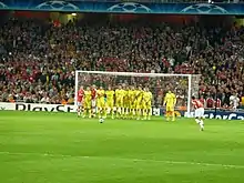 In the other games, Sporting CP departed the competition after setting a new Champions League record aggregate defeat of 12–1 to Bayern Munich. An early goal from Lukas Podolski extended Bayern's lead to 6–0 on aggregate and this was followed up by further strikes before half-time from Podolski again, Ânderson Polga (own goal) and Bastian Schweinsteiger, sandwiched by a consolation from Sporting's João Moutinho. Bayern were not finished at 4–1 as Mark van Bommel, Miroslav Klose and Thomas Müller further added to the scoreline.[16] Villarreal were the fourth side to make it into the quarter-finals by beating Panathinaikos 3–2 overall. Ariel Ibagaza put Villarreal 2–1 up on aggregate in the 49th minute, Evangelos Mantzios equalised six minutes later, but Joseba Llorente turned the tie in Villarreal's favour in the 70th minute and the match finished 2–1 to Villarreal.[17]