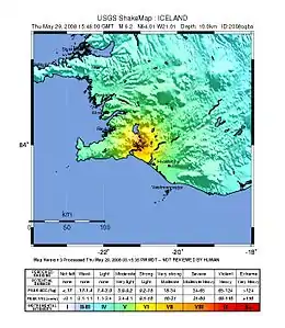 The 2008 Iceland earthquake was a doublet earthquake that struck on May 29 at 15:46 UTC in southwestern Iceland.[2] The recorded magnitudes of the two main quakes were 5.9 Mw and 5.8 Mw, respectively, giving a composite magnitude of 6.1 Mw.[4] There were no human fatalities, but injuries were reported and a number of sheep were killed. The epicenter of the earthquake was between the towns of Hveragerði and Selfoss, about 45 kilometers (28 mi) east-southeast of the capital, Reykjavík. It was the strongest earthquake to hit Iceland since the summer of 2000.[5]