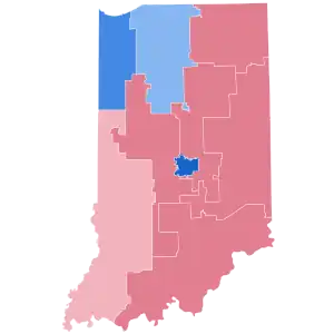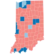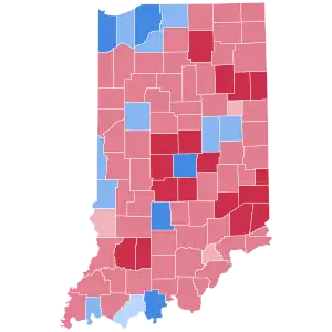 Obama won only 15 of Indiana's counties compared to 77 for McCain.[19] However those 15 counties make up 44% of the state's population. Obama carried the state largely by trouncing McCain in Marion County, home to increasingly Democratic Indianapolis, by over 106,000 votes. Kerry narrowly won Marion County in 2004; prior to that it last supported a Democrat in 1964. Obama also won in Vigo County, home to Terre Haute and a noted bellwether; it had voted for the winner of every presidential election all but twice since 1892 (the streak ended in 2020).[20] Not a single county in Indiana voted more Republican in the 2008 election than in 2004. Although Obama lost Allen County, home to Indiana's second largest city, Fort Wayne, by four points, he won in Fort Wayne city proper by 6 points.