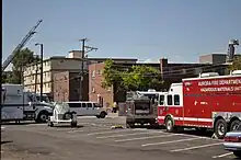 When apprehended, Holmes told the police that he had booby-trapped his apartment with explosive devices.[13] Police evacuated five buildings surrounding his Aurora residence, which was about 5 mi (8 km) north of the cinema.[40] Holmes' apartment complex is limited to University of Colorado Medical Center students, patients, and employees.[41][42] One day after the shooting, officials disarmed an explosive device that was wired to the apartment's front door, allowing a remote-controlled robot to enter and disable other explosives.[43] The apartment held more than 30 homemade grenades, wired to a control box in the kitchen and filled with at least 30 US gal (110 L) of gasoline.[44]