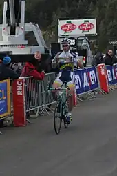 Liquigas–Cannondale rider Tiziano Dall'Antonia was the first to break 23 minutes for the climb,[70] but his stay at the top of the standings was short as Wiggins' team-mate Danny Pate, a former world time trial champion at under-23 level, went substantially quicker than Dall'Antonia, setting a benchmark of 21' 29" for the climb.[71] Wiggins shadowed his team-mate's run, in a car following him up the hill, to gather information about what lay ahead before his start time.[4] Pate's time held for almost 20 minutes until Lotto–Belisol's Bart De Clercq bettered his time, breaking the 21-minute barrier.[69] French riders then lowered the benchmark yet further; David Moncoutié, who finished fourth in the race's last time trial at the Col d'Èze,[68] recorded a time of 20' 11" for Cofidis,[70] but Jean-Christophe Péraud usurped that with the first sub 20-minute time. The Ag2r–La Mondiale rider, the 2009 national time trial champion, recorded a time of 19' 45"; a time that left his team manager Vincent Lavenu elated, with Péraud later expressing his surprise at such a quick time.[72]