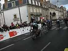 Veuchelen earned the majority of points on offer for the mountains classification, summiting the stage's first three climbs, cresting them all ahead of Lelay and Arashiro.[44] Movistar Team riders began to step up the pace on the front of the peloton, looking to set up the basis for an eventual attack at Mende by Valverde.[44] With around 50 km (31.1 mi) to go, Ag2r–La Mondiale's Blel Kadri exited the race, after breaking his left scapula in a crash.[42][45] On the Côte de l'Estrade, Astana's Kevin Seeldraeyers and Rabobank's Laurens ten Dam attacked off the front of the main field, and set off in chase of the lead quartet.[40] As Veuchelen continued to rack up points towards a mountains classification lead, Seeldraeyers and ten Dam continued to close on the lead group, and with around 10 km (6.2 mi) remaining, they latched on to the group as they were on the outskirts of Mende. The peloton caught all bar Veuchelen a short time later, with Veuchelen relenting to the foot of the final climb of the Côte de la Croix-Neuve–Montée Laurent Jalabert, before he too was engulfed by the main field through the advancing pace of several teams on the front of the pack.[40]
