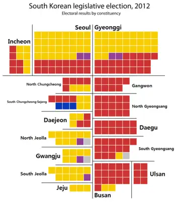 - 1 2 3 "S. Korea's ruling party pulls off upset victory in crucial general elections". Yonhap News Agency. 11 April 2012. Retrieved 11 April 2012.