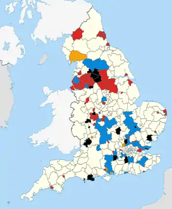 Map of the results following the elections in England. Black indicates a council in no overall control, whilst white indicates area where no elections took place.