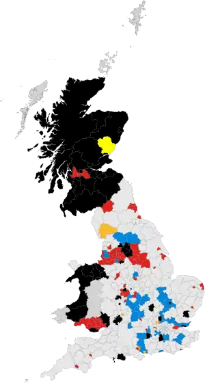 Map of the control of Scottish councils following the 2012 council elections. Black indicates no overall control, red indicates majority Scottish Labour control, and yellow indicates majority Scottish National Party control.