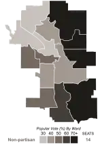 The 14 electoral wards were once again each represented by a single member on council, although the wards were changed slightly from the previous term. The neighbourhood of Martindale was moved from ward 3 to ward 5, and the community that expanded the neighbourhood of Cougar Ridge into ward 1 was with the rest of the neighbourhood in ward 6.[5] This election also marked a change in title for council members, from "Alderman", to "Councillor".