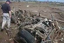 Further east, the tornado weakened to EF3 strength as it exited Moore, destroying six industrial buildings and damaging two others. A final small area of EF4 damage was noted nearby as two homes and a concrete building were leveled.[4] The tornado then began to rapidly narrow and weaken, snapping and uprooting several trees and causing EF2 damage to a farm just east of Moore, where the house lost its roof and an outbuilding was destroyed. A pickup truck slid 200 feet (61 m) away from the farm into a field while remaining upright. At 3:35 p.m. CDT, the tornado dissipated at a nearby tree line about one-third mile (0.54 km) east of Air Depot Boulevard.[19][4][36] The tornado traveled a total of 13.85 miles (22.3 km) over 39 minutes,[4]: 13 moving at an average rate of 21 miles per hour (34 km/h).[4]: 4 It reached a maximum width of 1,900 yards (1,737 m).[4]: 13