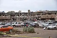 The tornado maintained its intensity as it struck the Orr Family Farm and the Celestial Acres horse training area, where up to 100 horses were reported killed, some being tossed into and tangled in downed power lines or thrown on top of nearby buildings; several horses that survived the tornado suffered severe injuries, with some being impaled by tree limbs or boards.[23][24] Every building at Celestial Acres was either leveled or swept away at EF4 intensity, the ground on the property was scoured to bare soil, debris from structures was granulated, and vehicles were thrown and stripped down to their frames. Surveyors noted that based on the contextual damage, the tornado was likely at EF5 intensity in this area, though the construction quality of the affected buildings only permitted an EF4 rating.[19][4] A 10-ton propane tank on the Orr Farm property was picked up and thrown more than a half-mile through the air by the tornado, and a strip mall near the farm was completely leveled as well.[19][4][25] The tornado continued east, heavily scouring an open grassy field before slamming into Briarwood Elementary School, which was completely destroyed. The NWS originally rated this damage EF5, but further evaluation and a 2014 study published by the American Meteorological Society revealed evidence of poor construction at the school, and the rating was downgraded to EF4. Remarkably, no fatalities occurred at the school.[19][26][27] Two 12,000-gallon water tanks that were also swept off of the Orr Family Farm grounds were thrown into this area; the roof of Briarwood Elementary was struck by one of them − potentially aiding in compromising the building's structural integrity as it bent the steel girders that held up the roof − shortly before the main vortex struck the building, while the other fell onto and destroyed a home a few blocks east of the school.[28] Past Briarwood Elementary, the tornado intensified even further and entered densely populated areas just west of Moore, including the Westmoor subdivision where many well-built, anchor-bolted brick homes were flattened at EF4 intensity, and two were swept clean from their foundations, with damage at those two homes rated EF5.[4][29]