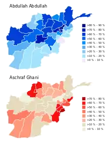 Presidential elections were held in Afghanistan on 5 April 2014, with a second round held on 14 June. Incumbent President Hamid Karzai was not eligible to run due to term limits. The registration period for presidential nominations was open from 16 September 2013 until 6 October 2013.[1] A total of 27 candidates were confirmed to be running for office.[2] However, on 22 October Afghanistan's Independent Election Commission disqualified 16 of the candidates, leaving only 11 in the race.[3] By April 2014 three candidates gave up the race and decided to support some of the eight remaining candidates. Opinion polls showed Abdullah Abdullah and Ashraf Ghani as the front-runners[4] and indeed the results of the first round of the election had Abdullah in the lead and Ghani behind him. The second set of results came after the run-off on 14 June, two months after the first round. Preliminary results were expected on 2 July and the final result on 22 July. However, widespread accusations of fraud delayed these results.[5] As a result, John Kerry, then United States Secretary of State, mediated the negotiations between the two final candidates, Ghani and Abdullah.[6] After a series of negotiations and talks between Ghani, Abdullah and Kerry, the two candidates agreed to sign an Agreement to form a National Unity Government[7] based on 50–50 power sharing. As a result of that political agreement, a separate position was created for Abdullah as Chief Executive.[8] The National Unity Government's term ran out after the next Afghan presidential election was held in September 2019.[9]
