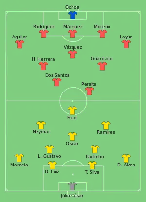 Mexican goalkeeper Guillermo Ochoa made four outstanding saves to deny Brazil.[19] In the first half, he saved a header from Neymar tight to his right to push the ball around the post, and blocked a close-range effort from Paulinho. In the second half, he saved a low shot from Neymar and a late point-blank header from Thiago Silva.[20]