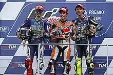 Jorge Lorenzo, Marc Márquez and Valentino Rossi, celebrating on the podium after finishing second, first and third at the MotoGP race.