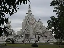 The damaged Wat Rong Khun, a major attraction in Mueang, Chiang Rai; The broken spire could be observed