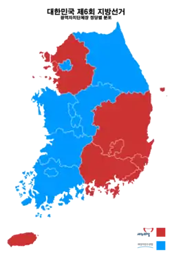 Maps of Metropolitan Mayors and Governors. Blue refers to NPAD, Red refers to Saenuri.