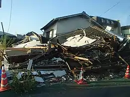 As a result of the tremors, the entirety of Kumamoto city was left without water.[26] All residents of Nishihara Village in Kumamoto Prefecture were evacuated over fears that a nearby dam could collapse.[26] Kumamoto Airport was also closed to all but emergency flights, and service on the Kyushu Shinkansen was suspended after a train derailed due to the earthquake.[27] Numerous structures collapsed or caught fire as a result of the earthquake. Government officials estimated more than 1,000 buildings had been seriously damaged, with 90 destroyed.[28] A 500-bed hospital in Kumamoto City was knocked off its foundations, forcing the evacuation of all patients,[8] and a natural gas leak prompted Saibu Gas to turn off supplies to multiple homes in the city.[16]