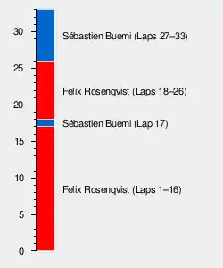 Rosenqvist won the pole position by recording the fastest lap in qualifying and pulled away from the rest of the field to keep the lead until the mandatory round of pit stops when Buemi led for one lap until he made his stop. Rosenqvist regained the lead but was required to conserve electrical energy because he made a pit stop a lap earlier than other drivers. This allowed Buemi to narrow the time deficit between the two drivers and he passed Rosenqvist for the lead on the 27th lap. Buemi held it for the remainder of the race to win. There were two lead changes among two different drivers during the course of the race.