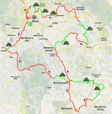 The course ran over the hilly terrain of the Chianti region and included nine sectors and a total of 52.8 km (32.8 mi) of dirt road.[2] The first sector was addressed just 11 km after the start; the longest and most arduous sectors were the ones in Lucignano d’Asso (11.9 km) and Monte Sante Marie (11.5 km).[3] The last stretch of gravel road came at 12 km (7 mi) from the finish in Siena.[4] The race finished on Siena's illustrious Piazza del Campo, after a narrow ascent on the roughly-paved Via Santa Caterina in the heart of the medieval city, with steep stretches of up to 16 % gradient.[2][3]