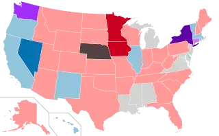 | Nebraska | 25[lower-alpha 6] | 49[lower-alpha 6] | 51[lower-alpha 6] | 4 | N/A (unicameral) | |||