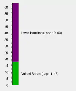 During the safety car period George Russell, who had been running in 10th, spun and crashed his Williams car into a wall between Piratella and Aqua Minerale whilst trying to warm his tyres. After the safety car restart Daniil Kvyat moved up several positions into fourth place whilst Alex Albon spun from fifth and dropped to the back. Ricciardo inherited third place behind the two Mercedes drivers after Sergio Pérez pitted for new tyres behind the safety car.[12][13][14]