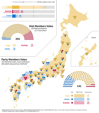 In all other prefectures, Suga prevailed, winning either all three prefectural delegates, or two with the third going to Ishiba, depending on the vote margin of his victory and on whether the primary voting system was d'Hondt proportional, as it was in the majority of prefectures, or FPTP.[23]