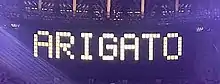 After the fireworks display a trailer of the then upcoming Tokyo 2020 Paralympic Games was screened.[72] Finally, one of the large screens showed a goodbye message with the word "Arigato" which is shown in the same font as the word "Sayonara" was during the closing ceremony of the Olympic Games Tokyo 1964 using stop-motion toy cubes rather than scoreboard lettering. This was a homage and a gratitude to all the people who were involved in the two times the city hosted the Summer Olympic Games (1964 and 2020).[73][74]