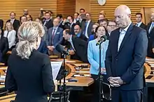 Kemmerich accepted the election without hesitation and was sworn in.[23] Later, Christian Lindner justified this by saying that Kemmerich had been "overwhelmed" by the situation.[27] After Reinhold Maier, he was thus the second elected FDP Minister President of a state in the history of the Federal Republic of Germany, but at the same time the first Minister President ever to come from the ranks of the smallest parliamentary group in the Landtag and to rely on votes from the AfD for his election.[28][29] In terms of electoral law, the election of the Minister President was formally flawless; however, there was a consensus between the Union parties and the FDP on the one hand and the Left, SPD and Greens on the other hand, both in Thuringia and throughout Germany, not to enter into a coalition with the AfD, led in Thuringia by Björn Höcke, a politician considered by most to be on the extreme right-wing.