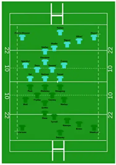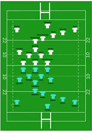 | 21:00 CET (UTC+01:00) | Try: Forlani 5' c Banet (2) 17' c, 32' c Annery 44' c Penalty try 78' Sansus 80' +1 c Con: Trémoulière (4/4) 6', 18', 33', 45' Bourdon (1/1) 80' +2 Pen: Trémoulière (1/1) 12' |