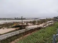 The capital Sarajevo was impacted by the floods the most.[5] The main roadways in Sarajevo were under water, causing traffic slowdowns. The flooding hit Otes the most. Many houses were flooded and some cars were stuck in the water. Firefighters, the police, the Agency for Civil Protection of the Sarajevo Canton (as well as the municipal agencies), and volunteers managed the situation. There was a shortage of manpower and not all affected objects were quickly helped.[6] Traffic between Otes and the rest of the city was cut off by the floods.[7] The rivers Željeznica and the Tilava flooded Butmir and Gornji Kotorac, where tens of objects were affected. The bridge Most spasa (Salvation bridge) connecting Butmir and the neighbourly settlement Sokolović Kolonija was submerged.[8] There had been traffic obstructions on the routes connecting Boljakov Potok, Pofalići, and Stup.[9] Floods were contained in Stari Grad owing to high responsiveness and cleaning of surface drains.[10] Schools were closed in Ilidža, where volunteer actions to set up sandbags took place.[11] The rivers were slowly receding to their riverbeds between 6 and 11 November.[12]