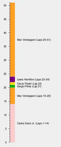 Polesitter Carlos Sainz Jr. had a good start and held off second-placed Max Verstappen for the first 14 laps. Even when Verstappen was allowed DRS, he was unable to make an overtake as Sainz continued to make a strong defence. Sainz locked up coming into the first corner on lap 15, giving Verstappen a chance. Verstappen eventually passed Sainz and led the race for the next five laps until he came in for a stop. Meanwhile, George Russell and Sergio Pérez were having their own fight for fourth place behind Charles Leclerc. On lap 14, Pérez was able to pass Russell at the first corner, but both cars missed the chicane and Pérez had to give the position back. Due to another incident against Esteban Ocon at the same corner after his stop, in which Russell overtook Ocon off the track, Russell was given a five-second penalty.