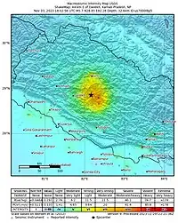 The United States Geological Survey (USGS) said the earthquake had a magnitude of Mww 5.7 and a depth of 32.6 kilometres (20.3 mi). Nepal's National Earthquake Monitoring and Research Center recorded the earthquake at 6.4 on the local magnitude scale (ML ).[12] The epicenter was estimated to be in Ramidanda, in Jajarkot District.[2] The fault plane solution was determined to be reverse faulting along a northwest–southeast trending plane dipping either northeast or southwest.[5] At least 483 aftershocks were recorded following the mainshock.[13] At least six of them were of magnitudes above 4.0.[14] A magnitude 5.3 aftershock occurred on 6 November.[15]
