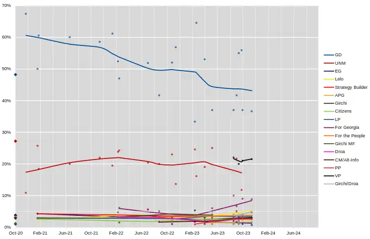 | 30 September–20 October 2023 | 1,212 | Gorbi | 55 | 20 | With VP | 3 | 4 | With VP | 2 | 1 | 1 | 2 | 3 | 4 | With Girchi-Droa | With Girchi-Droa | - | - | - | - | 5 | - | 35 |