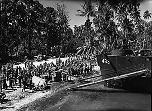 In mid-September, the 37th Battalion departed for the island of Vella Lavella, west of Guadalcanal.[13] The southern part of the island was held by the United States Army while the Japanese continued to hold coastal positions in the north.[14] The battalion landed on the island on 18 September[13] and four days later, it struck out for the north. A series of amphibious landings along the eastern side of the island was planned while the 35th Battalion did the same around the western side.[15]
