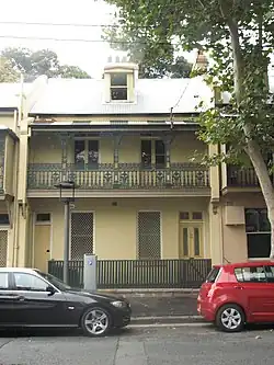 A simple well-proportioned two-storey Victorian terrace house with four bedrooms. Features include a cantilevered balcony over footpath, a corrugated iron verandah painted in wide stripes, two french doors on upper storey, panelled front door with fanlight and two sash windows with slab sills on ground floor. Also, a second doorway on ground floor, and a dormer window to attic room. Storeys: Two; Construction: Painted rendered masonry. Corrugated galvanised iron roof. Timber balcony structure and cast iron column supports for verandah roof. Iron lace balustrading. Timber front fence. Style: Victorian Filigree.[1]