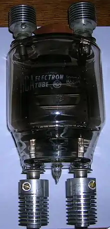 The 833A is a large tube of the type sometimes known as a "cookie jar" tube,[1] with the envelope nominally measuring 116.8 mm (4.60 in.) in diameter and 219.2 mm (8.63 in.) in height. The 833A contains a thoriated tungsten filament rated at 10 volts and 10 amps. A pair of 833A's with adequate forced air cooling can deliver 1000 watts of CCS RF power operating as a class C amplifier plate modulated stage.