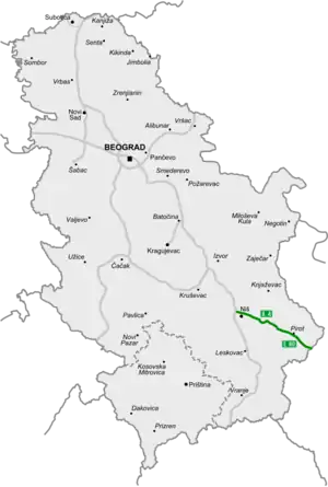 Motorway begins at Trupale interchange near Niš, at the junction with A1 motorway and runs eastward, to the Gradina border crossing with Bulgaria, near Dimitrovgrad. The motorway is part of the Pan-European corridor X and is planned to be connected with the Bulgarian Europe motorway that will run to Sofia.