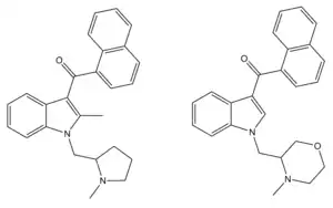 A number of related compounds are known with similar potent cannabinoid activity, with modifications such as substitution of the indole ring at the 2- or 6-positions, the naphthoyl ring substituted at the 4-position or replaced by substituted benzoyl rings or other groups, or the 1-(N-methylpiperidin-2-ylmethyl) group replaced by similar heterocyclic groups such as N-methylpyrrolidin-2-ylmethyl or N-methylmorpholin-3-ylmethyl.[4][5][6] AM-1220 was first detected as an ingredient of synthetic cannabis smoking blends in 2010.[7]
