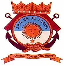 ARA Veinticinco de Mayo badge with the motto "Juramos con gloria morir" which means "We swear to die gloriously", a reference to the Argentine National Anthem.