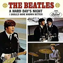 "A Hard Day's Night" is a song by the English rock band the Beatles. Credited to Lennon–McCartney, it was written by John Lennon,[2] with some minor collaboration from Paul McCartney. It was released on the film soundtrack of the same name in 1964. It was also released as a single in the UK (with "Things We Said Today" as its B-side), and in the US (with "I Should Have Known Better" as its B-side.)